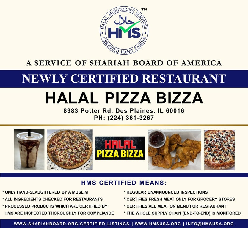 HMS has Certified Halal Pizza Bizza, Des Plaines, IL as of March 14, 2025.