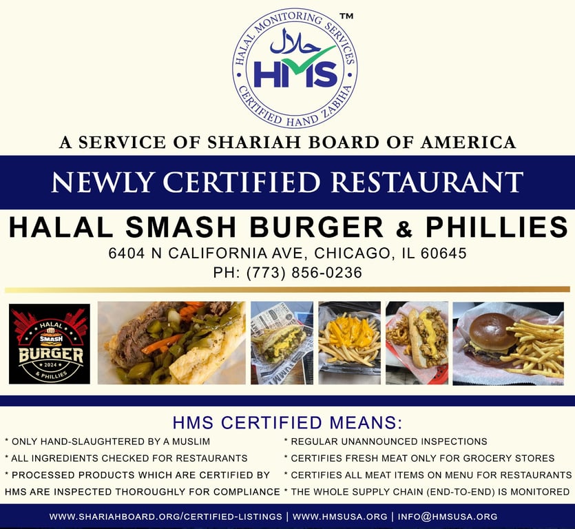 HMS has Certified Halal Smash Burger & Phillies as of May 12, 2024.