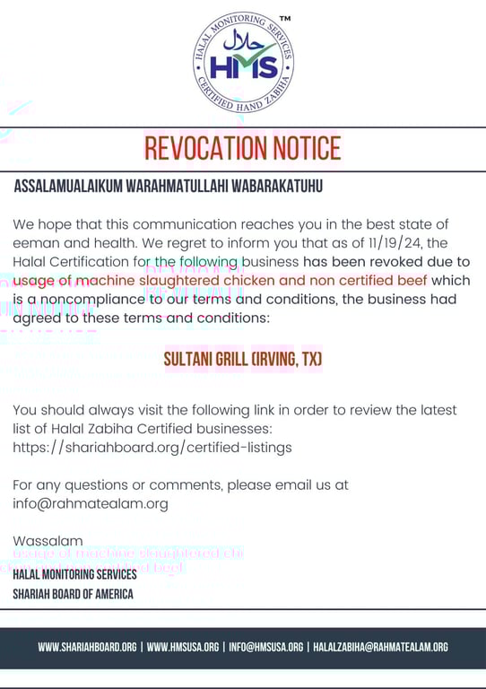 HMS Halal Certificaiton has Revoked Sultani Grill, Irving, TX certification as of November 19, 2024, due to mixing of machine slaughtered chicken and non certified beef which is noncompliance to the terms and conditions the business agreed to at the time of certification.